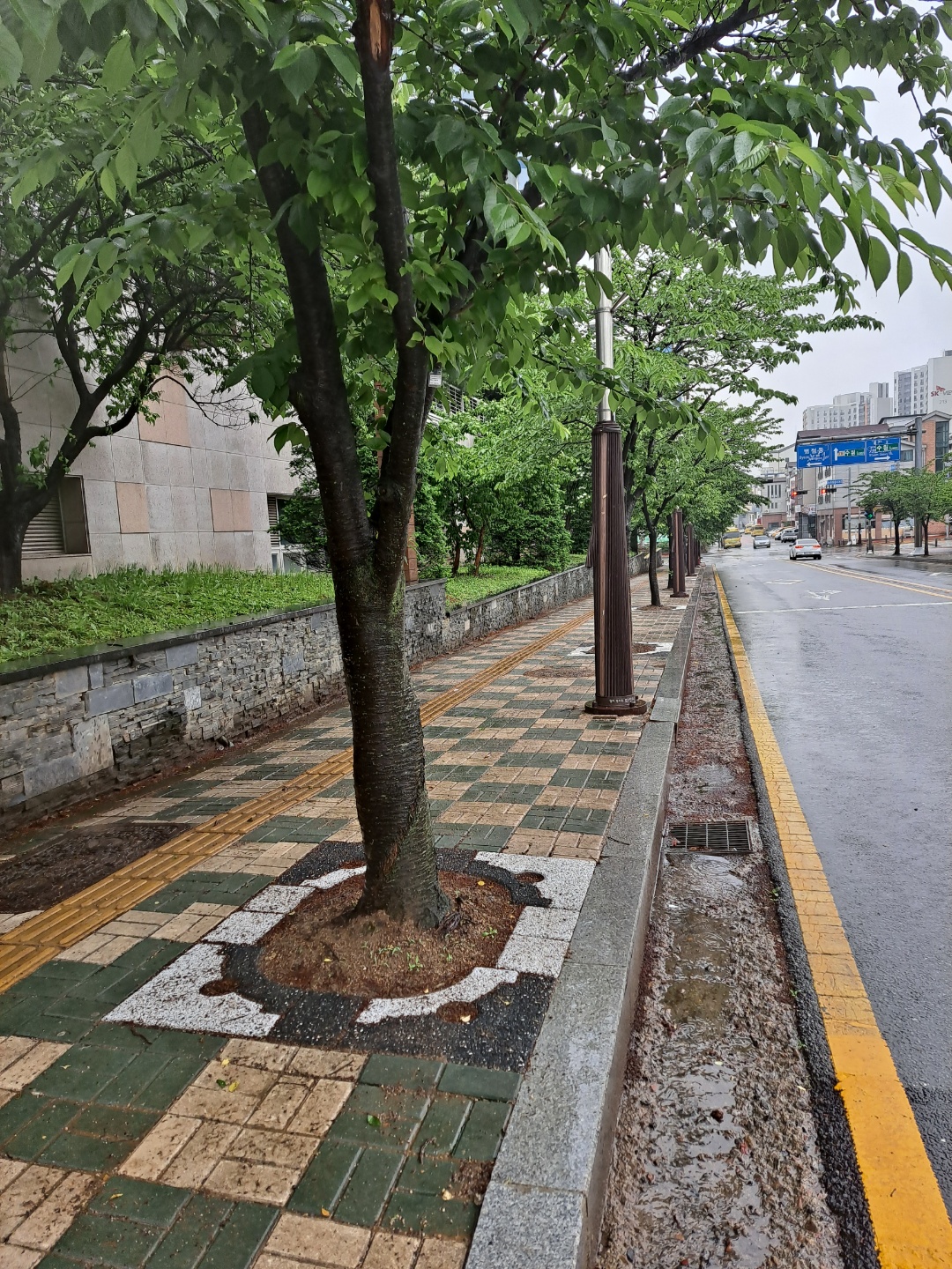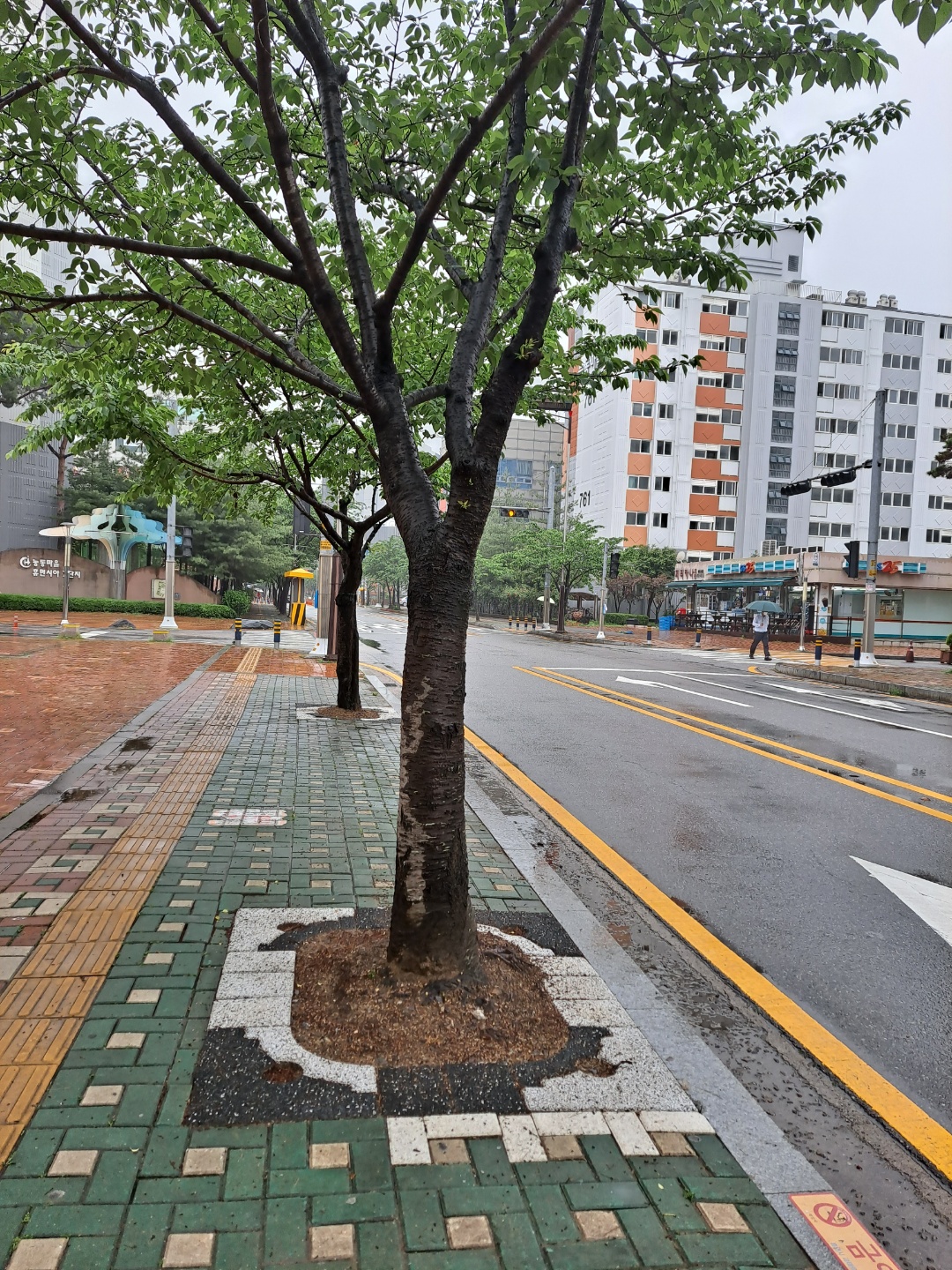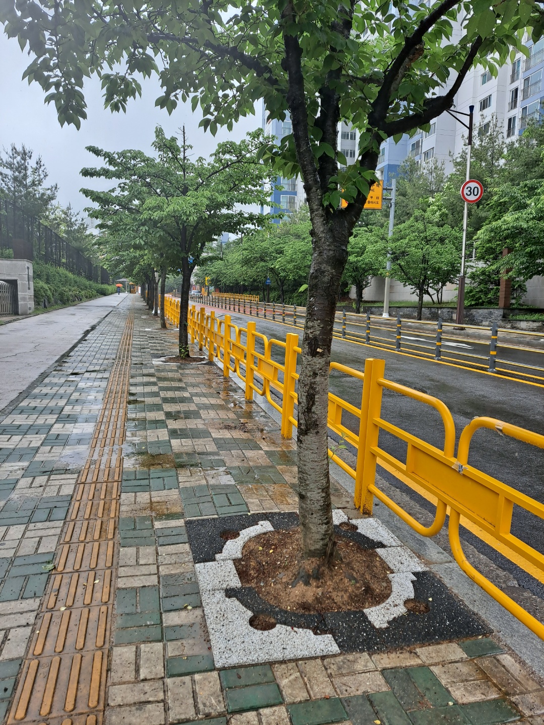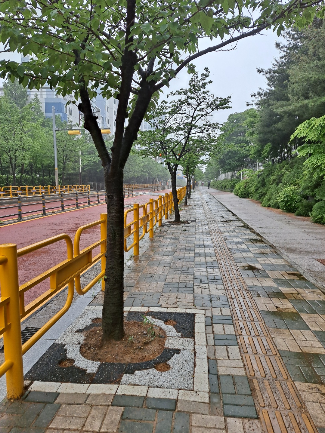 비오는 날 산뜻한 도심숲길...... 가변형 친환경 투수성 가로수보호덮개.
