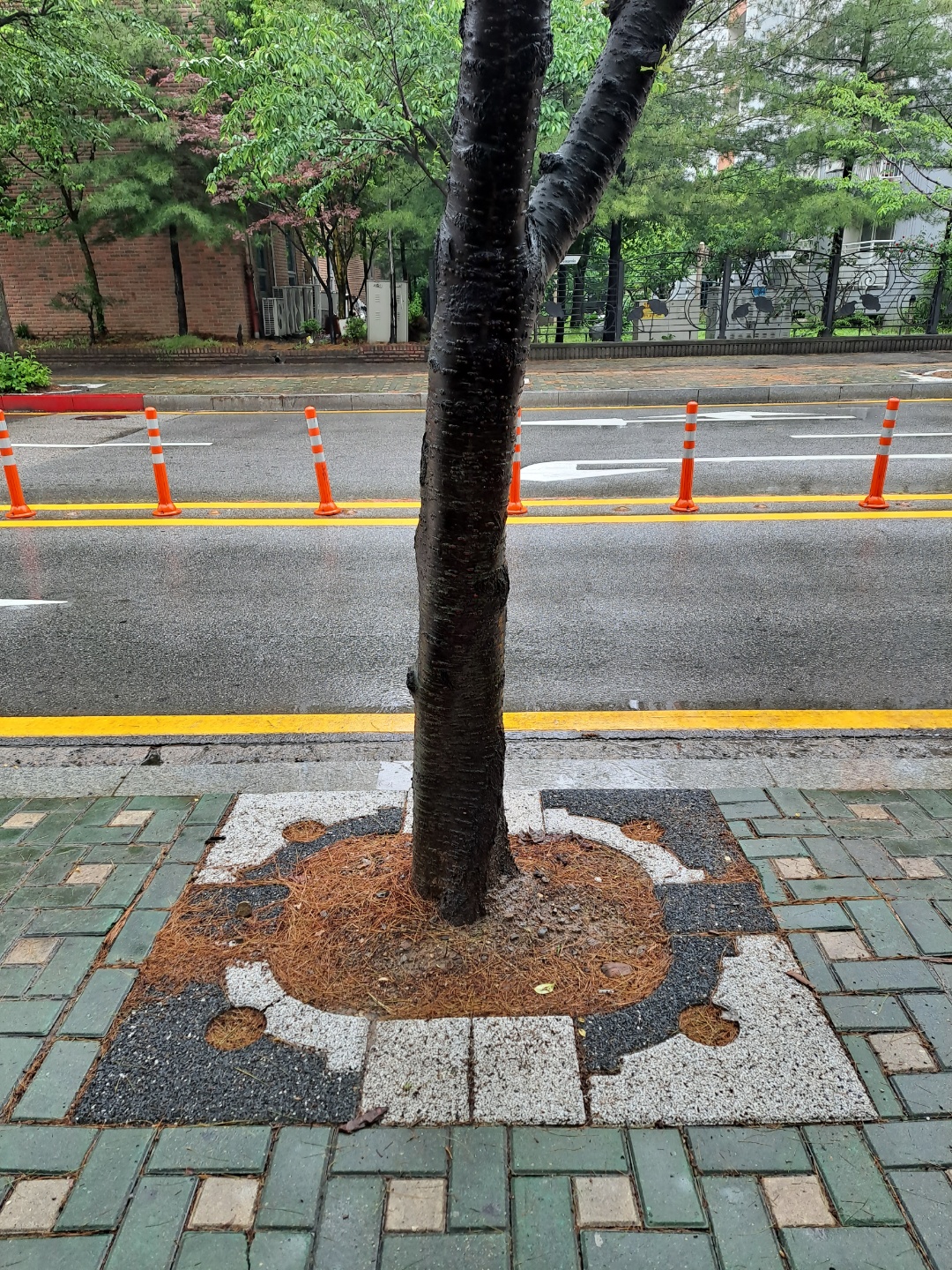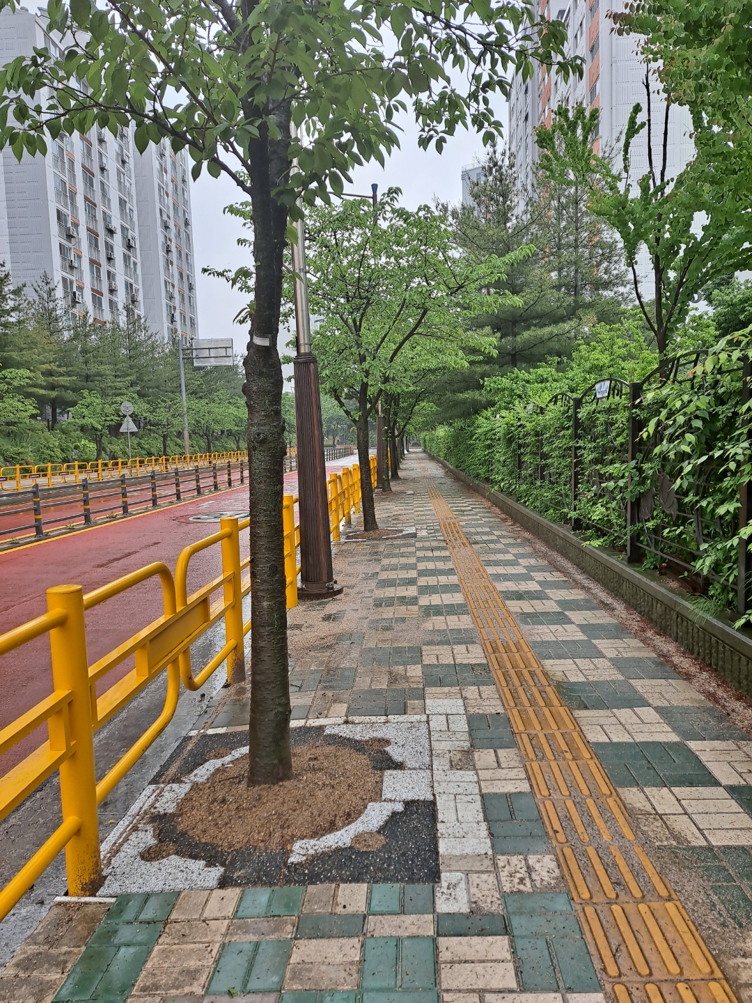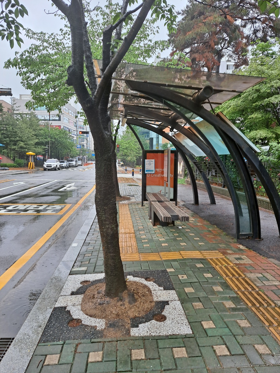 비오는 날 산뜻한 도심숲길...... 가변형 친환경 투수성 가로수보호덮개.