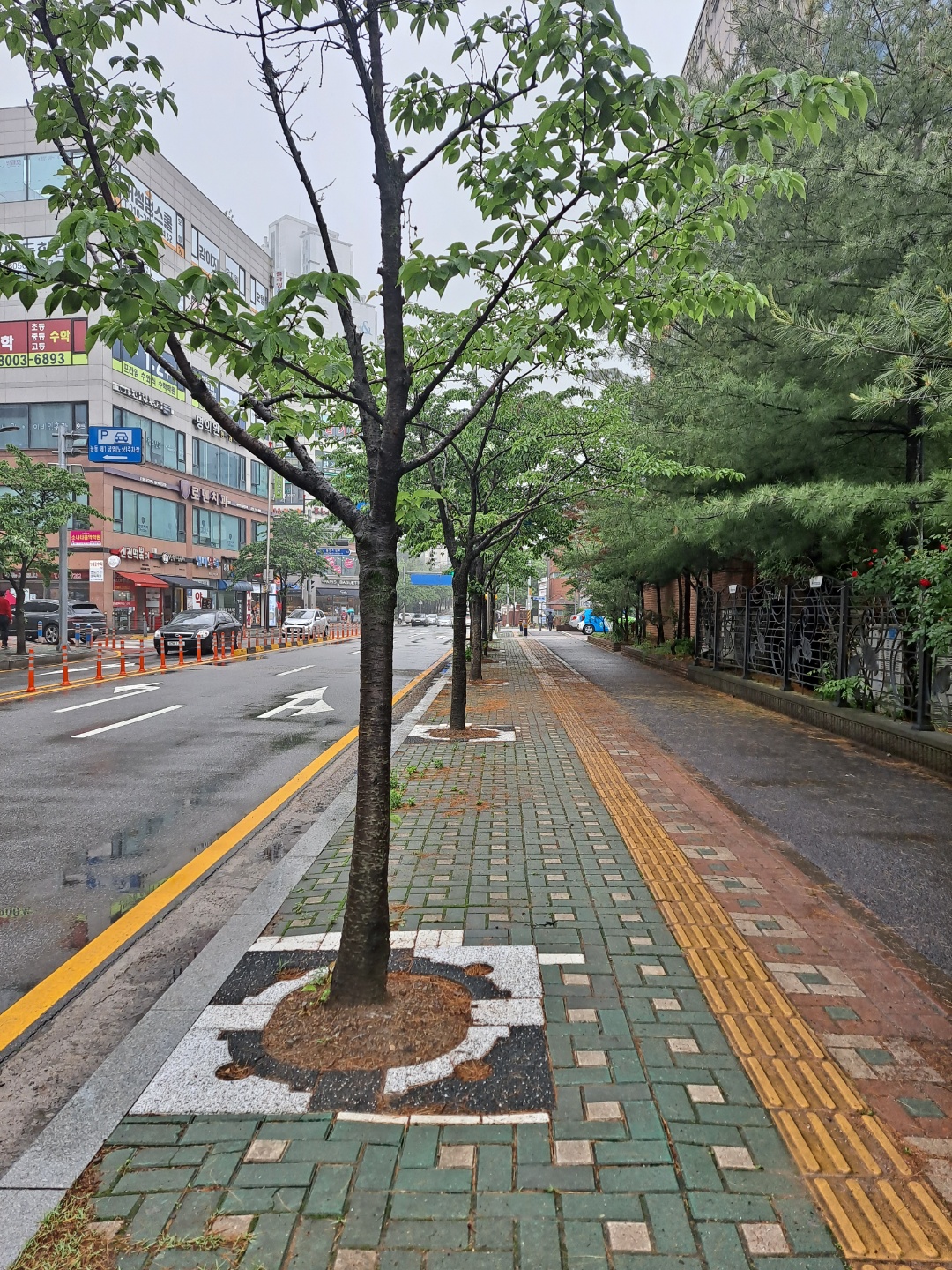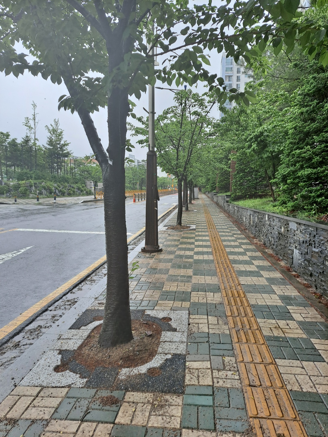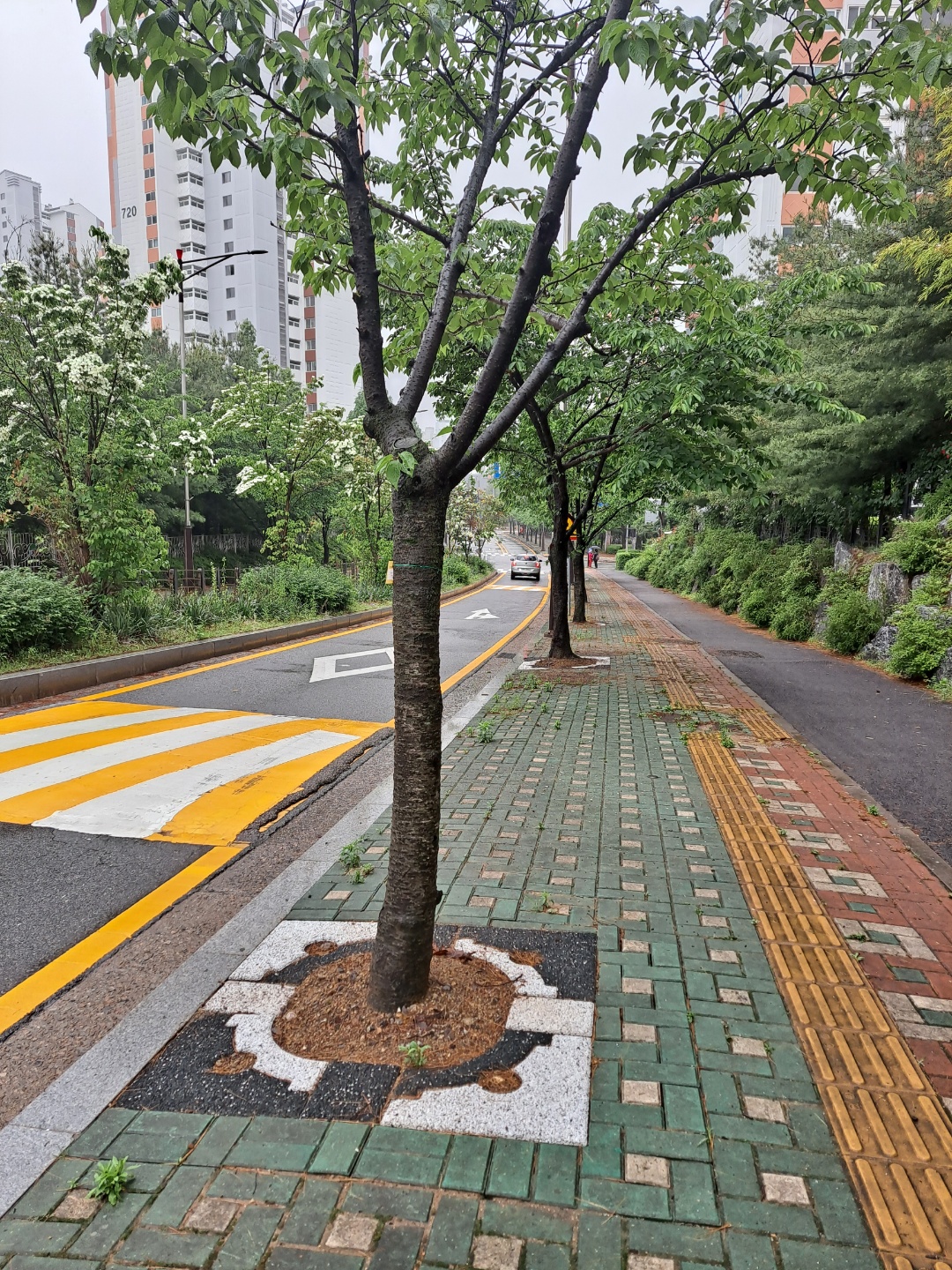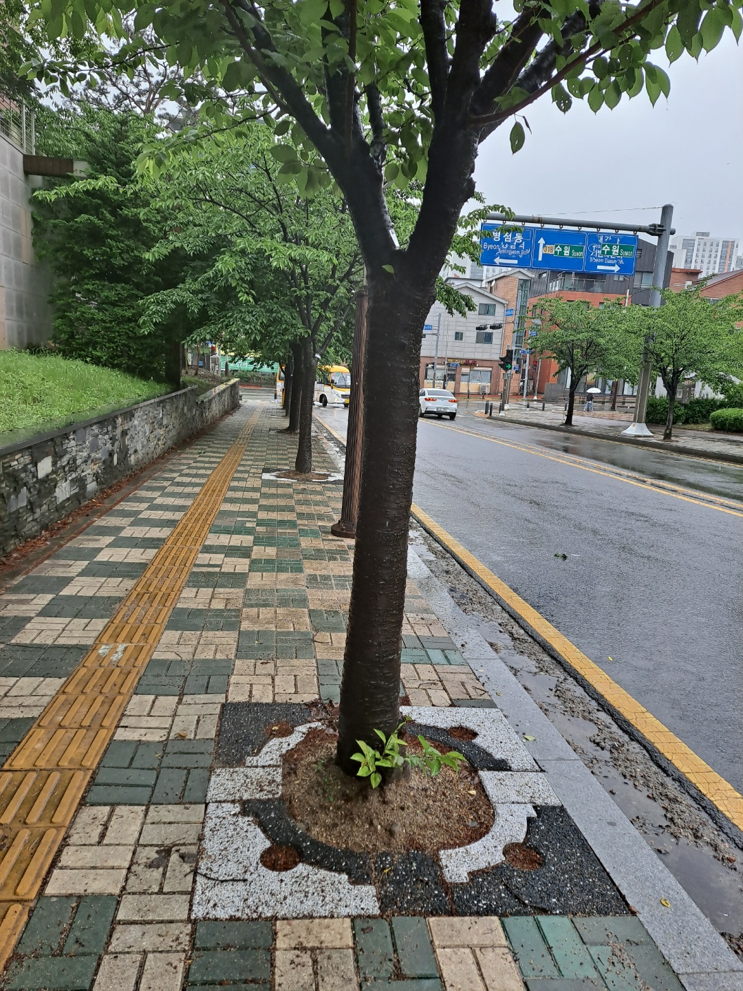 비오는 날 산뜻한 도심숲길...... 가변형 친환경 투수성 가로수보호덮개.