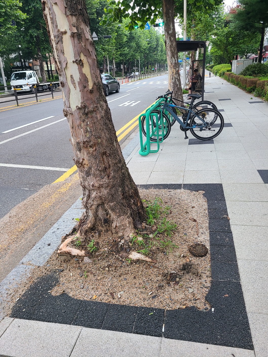 장수가로수나무 플라타너스, 버즘나무를 밑받침한 가로수보호덮개~