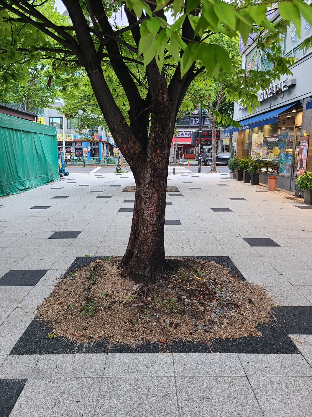장수가로수나무 플라타너스, 버즘나무를 밑받침한 가로수보호덮개~